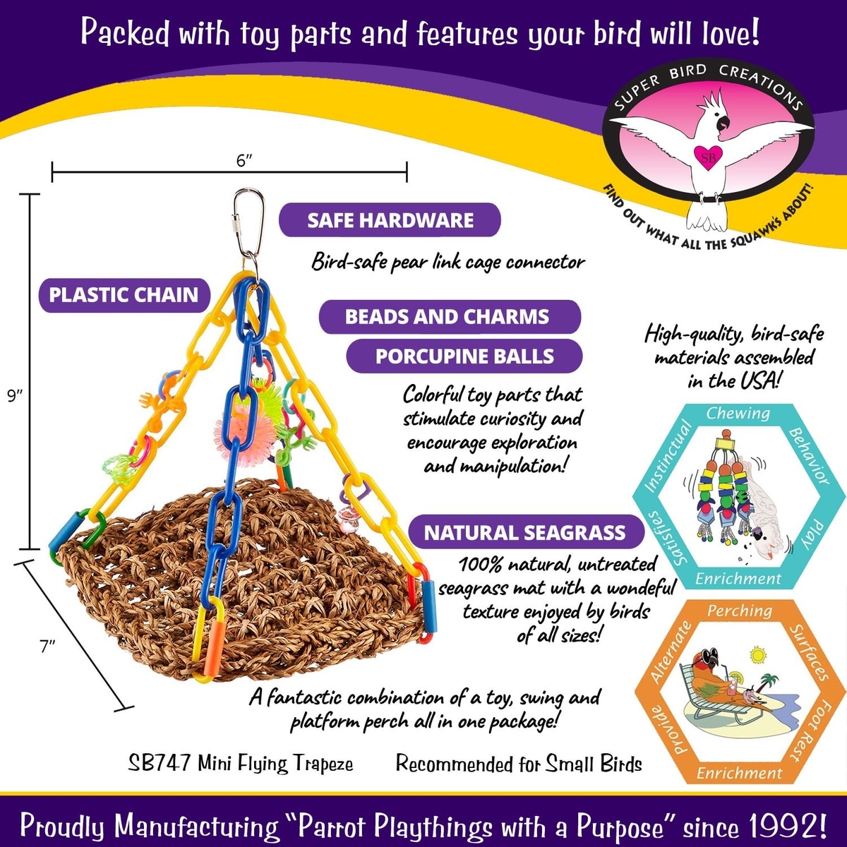 Super Bird Creations, inspired by a lifelong love of pet birds, was founded in 1992 with the goal of creating safe, fun, and stimulating toys for pet birds.