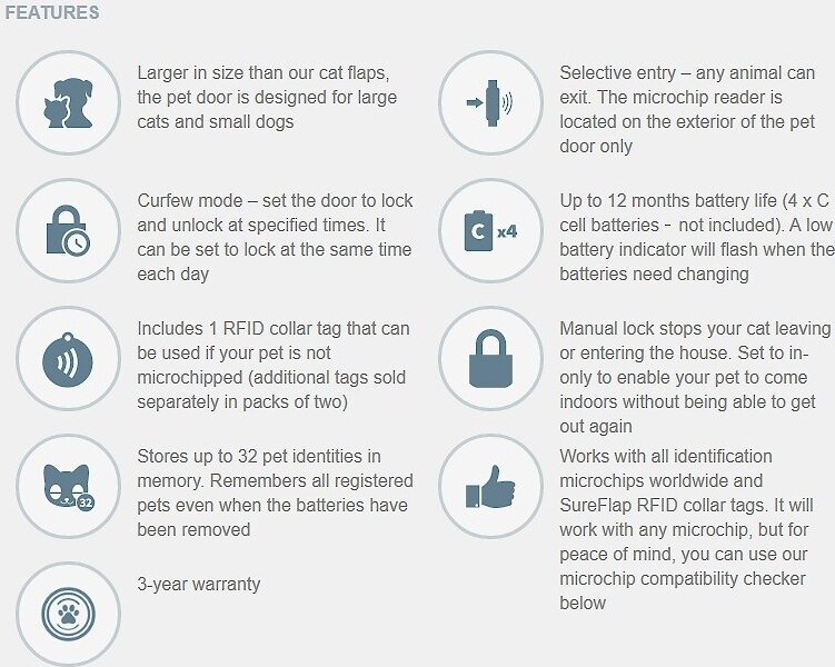 Once programmed, the SureFlap Microchip Pet Door will only allow entry for your pet(s), denying access to intruder animals. The SureFlap Microchip Pet Door also has a number of custom modes to accommodate less common requirements. Select Custom Mode 5 to provide further protection against intruder animals. This mode registers the presence of an intruder trying to enter the house and closes the outer lock to prevent the door being pulled open or outwards. This mode is only needed in very rare cases of very persistent and very dexterous intruder animals.