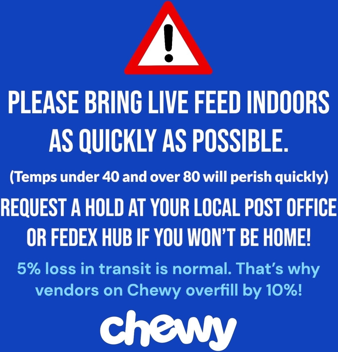First shipment was deemed damaged by delivery company after I received a phone call from them stating the worms were all through their truck. Chewy replaced this