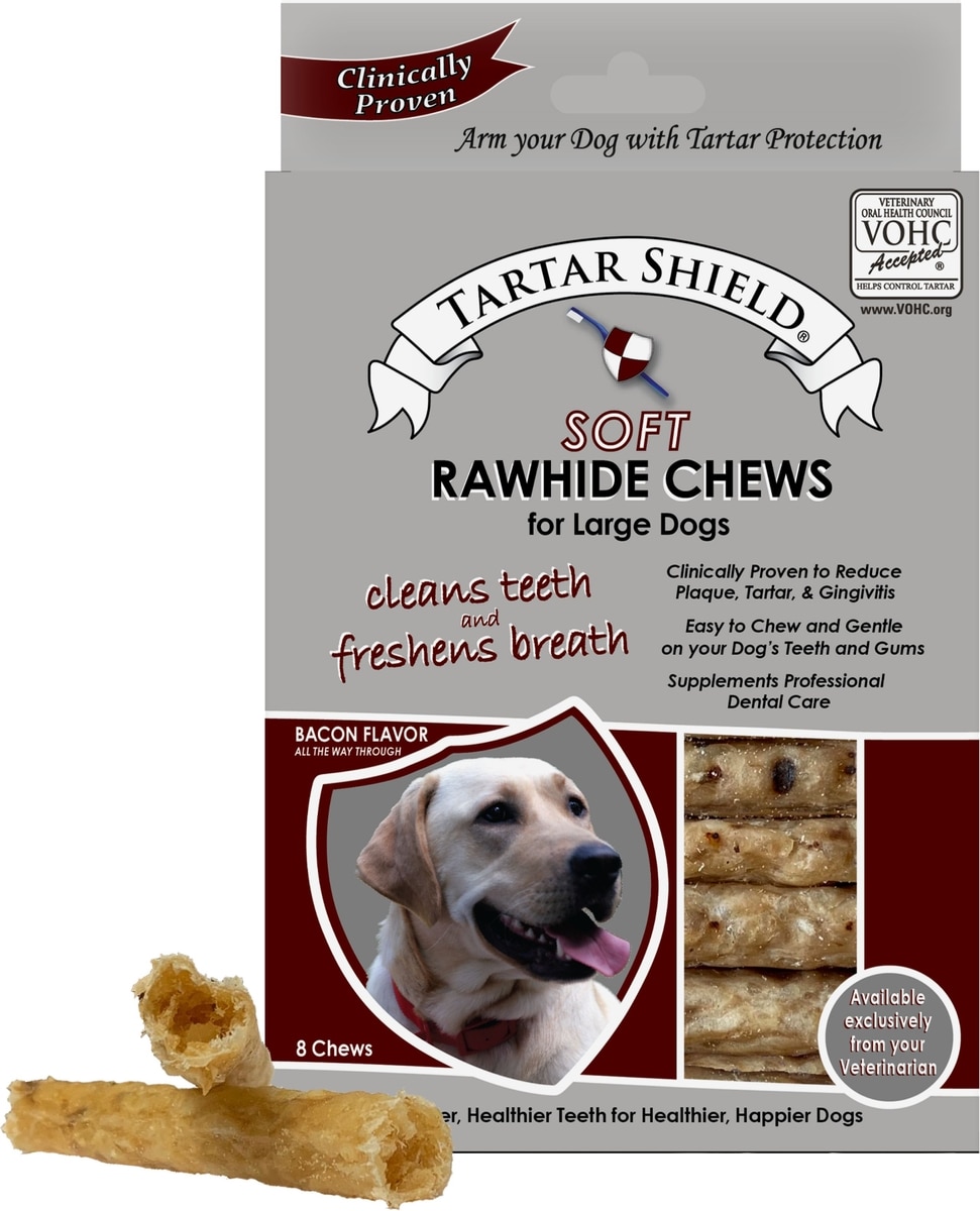 A Revolution in Rawhide Say goodbye to the days of conventional rawhide or hard yak chews. Trusting what you give your dog is essential, and that's why Tartar Shield Soft Rawhide Chews are VOHC-approved and made with only four ingredients.