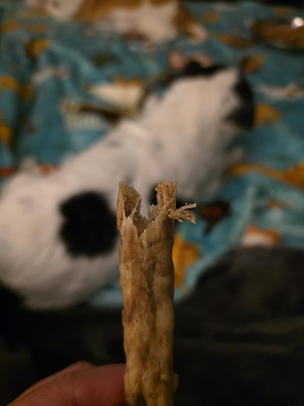 Each chew is backed together with no glues or dies. With each bite, the chew helps scrape off plaque and tartar and then break apart into bacon-sized pieces. Its two active ingredients stay in the mouth for hours to provide lasting protection.