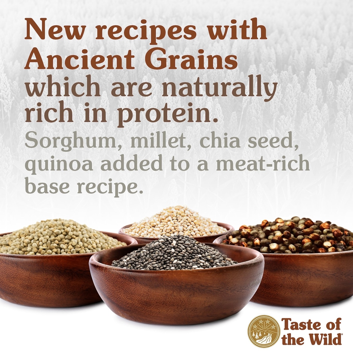 Sorghum, millet, chia seed and quinoa—these healthy and nutritious grains have remained largely unchanged over thousands of years. Naturally rich in protein, fiber and the vitality-giving nutrients our wild companions need to thrive, Taste of the Wild® pairs these ancient grains with their unique animal protein bases for a healthy new recipe.