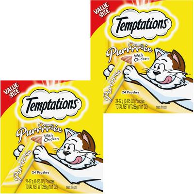 - Temptations Creamy Puree Salmon, Chicken & Tuna Variety Pack Lickable Cat Treats, 0.42-oz pouch, 24 count$13.28 Chewy Price$13.99 List Price$12.62 Autoship PricePromo, New Customers Only: Spend $49+, Get $20 eGift Card