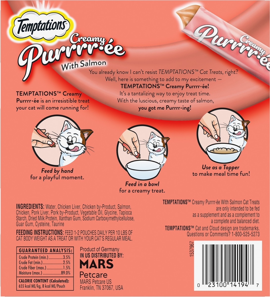 - Temptations Creamy Puree with Chicken Lickable Cat Treats, 0.425-oz pouch, 24 count$13.28 Chewy Price$13.99 List Price$12.62 Autoship PricePromo, New Customers Only: Spend $49+, Get $20 eGift Card