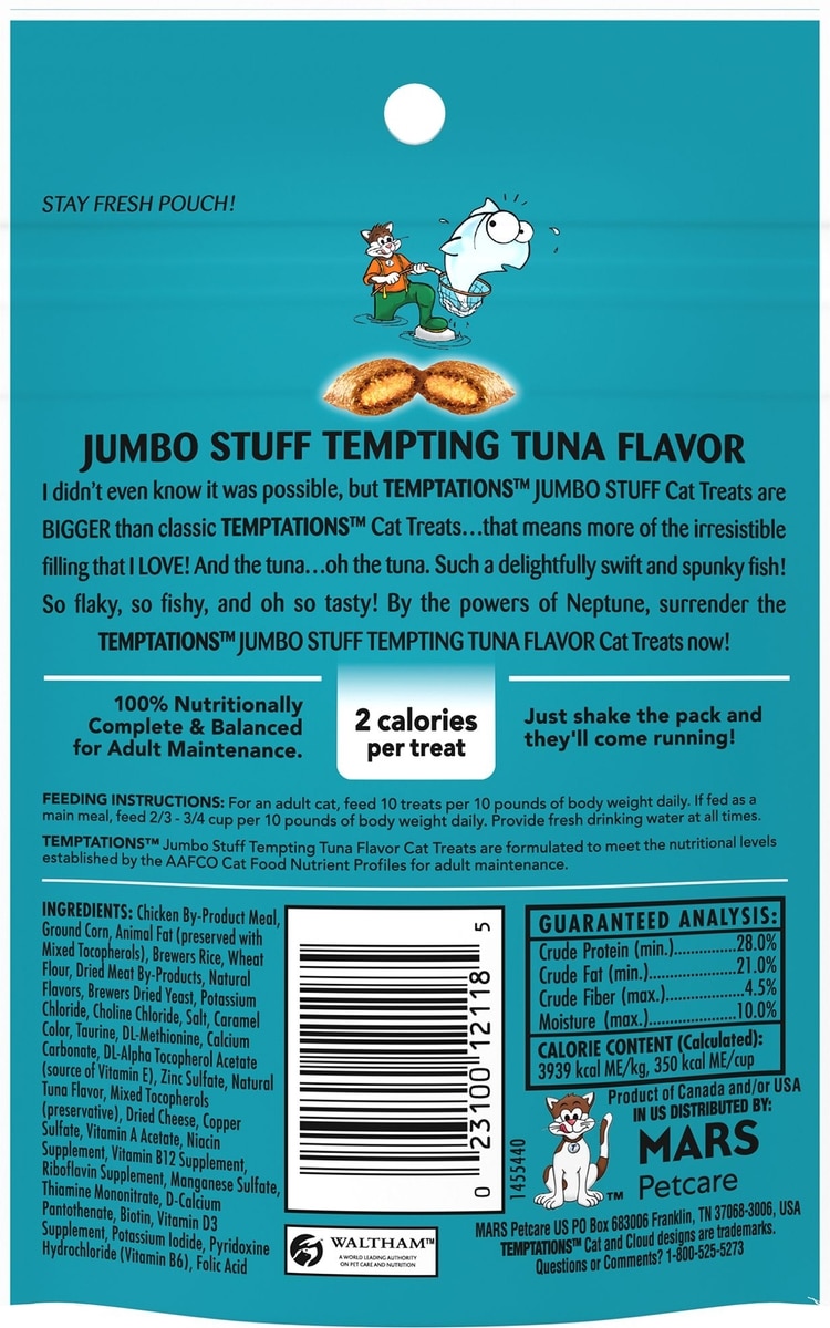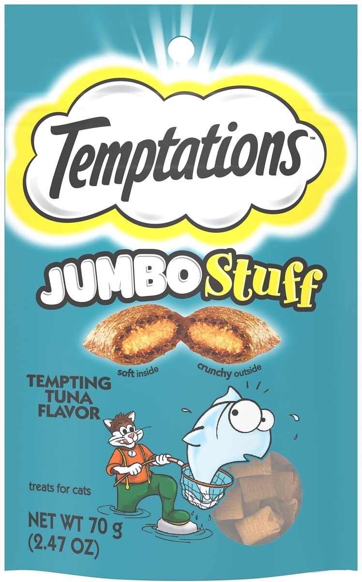 Give your kitty more of what she wants. Temptations Jumbo Stuff Cat Treats are bigger than Temptations Classic Cat Treats—that means even more of the irresistible filling your cat loves. At just 2 calories a treat, you can feel good about feeding your cat Temptations Jumbo Stuff Treats. Plus, they come in resealable pouches and tubs—great for easy treating and keeping your kitty’s paws off of them when you’re not watching!