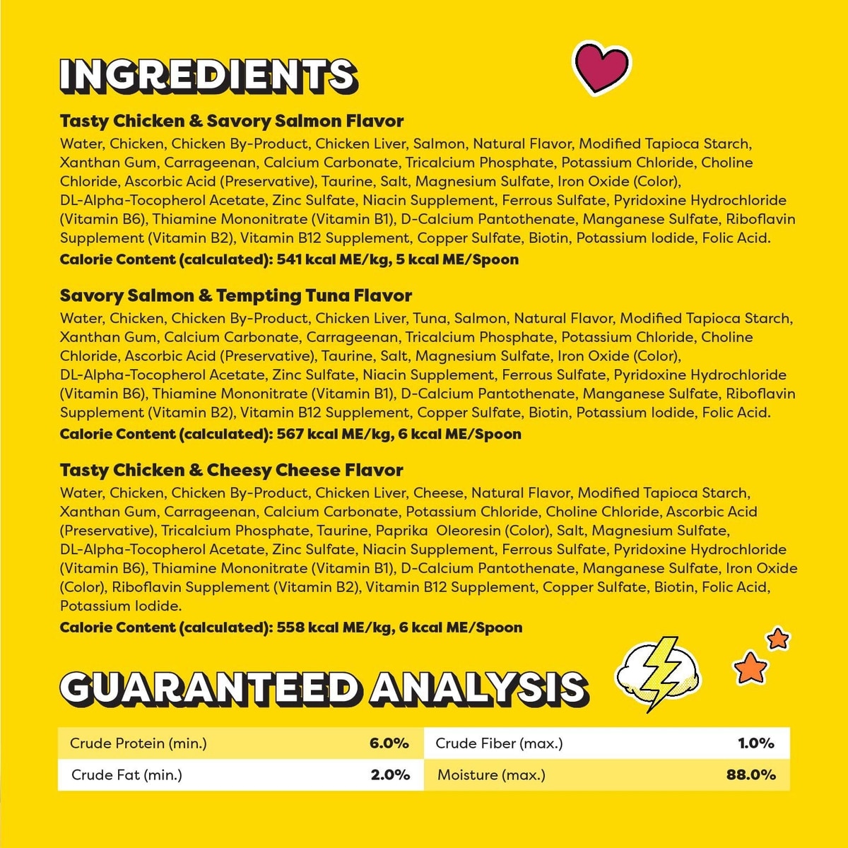 - Temptations Creamy Puree Salmon, Chicken & Tuna Variety Pack Lickable Cat Treats, 0.42-oz pouch, 24 count$13.28 Chewy Price$13.99 List Price$12.62 Autoship PricePromo, New Customers Only: Spend $49+, Get $20 eGift Card