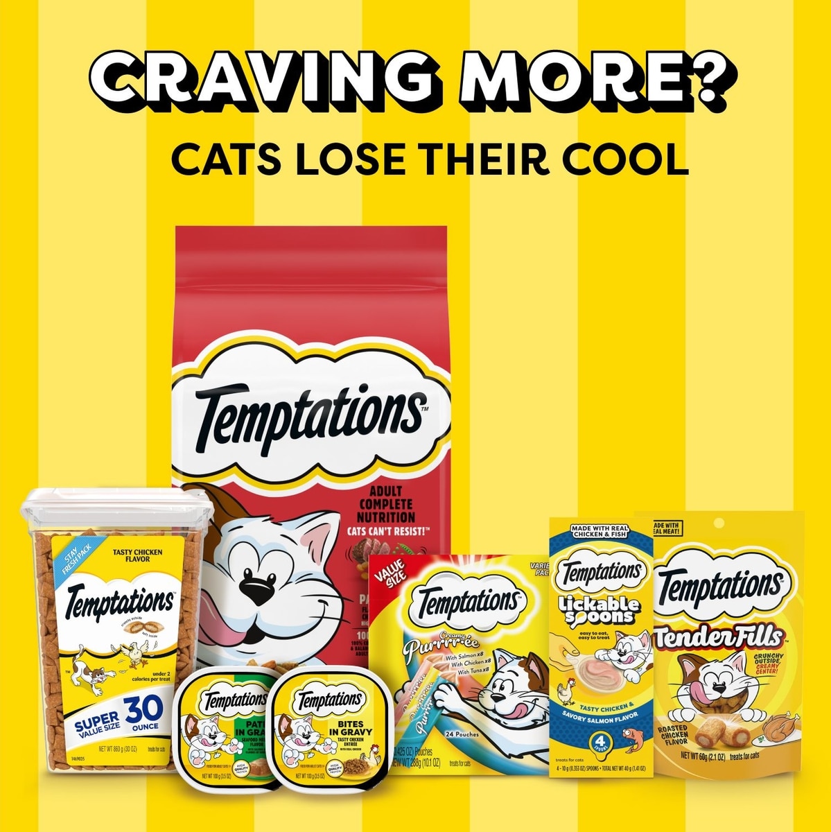Temptations Treats and Cat Food are the vibe your cats are looking for. Try their mouthwatering menu of fun flavors and textures, from Creamy Purrrr-ée to Dry Cat Food—sure to please even the pickiest felines!