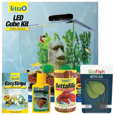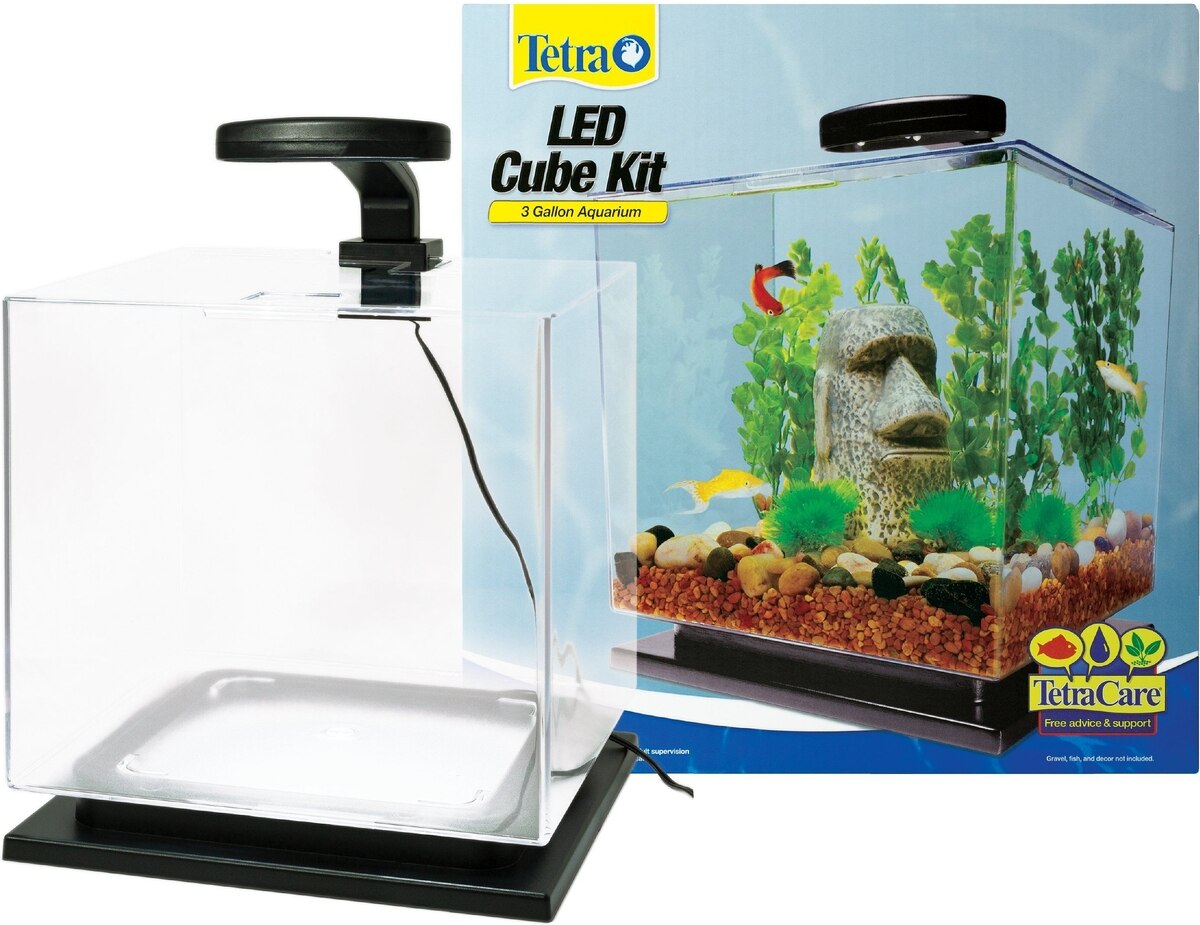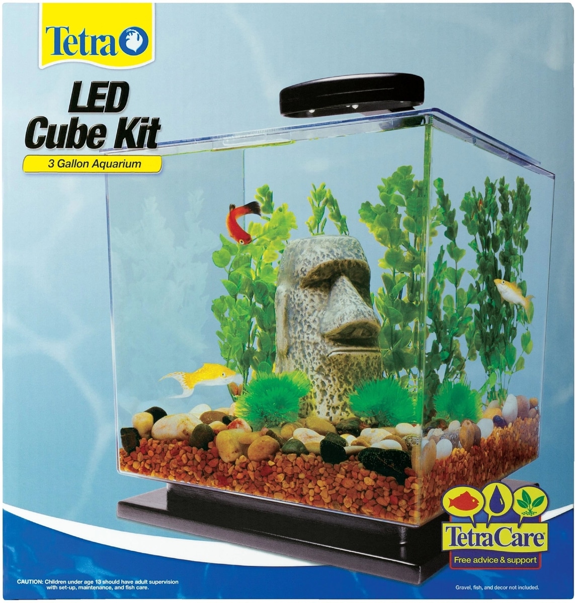Tetra LED Cube Kit Fish Aquarium, 3-gal—The Tetra LED Cube Shaped Fish Aquarium provides everything you need to set up a modern new home for your fish. The compact, 10-inch square tank fits almost anywhere and is made of virtually unbreakable plastic.