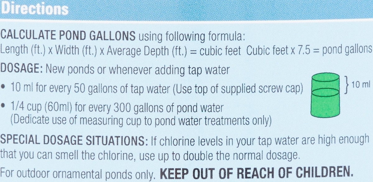 For a pond treat with 1/4 cup (60 ml) for every 300 gallons of pond water. For a 5000 gallon pond, that would equate to roughly 4.2 cups.
