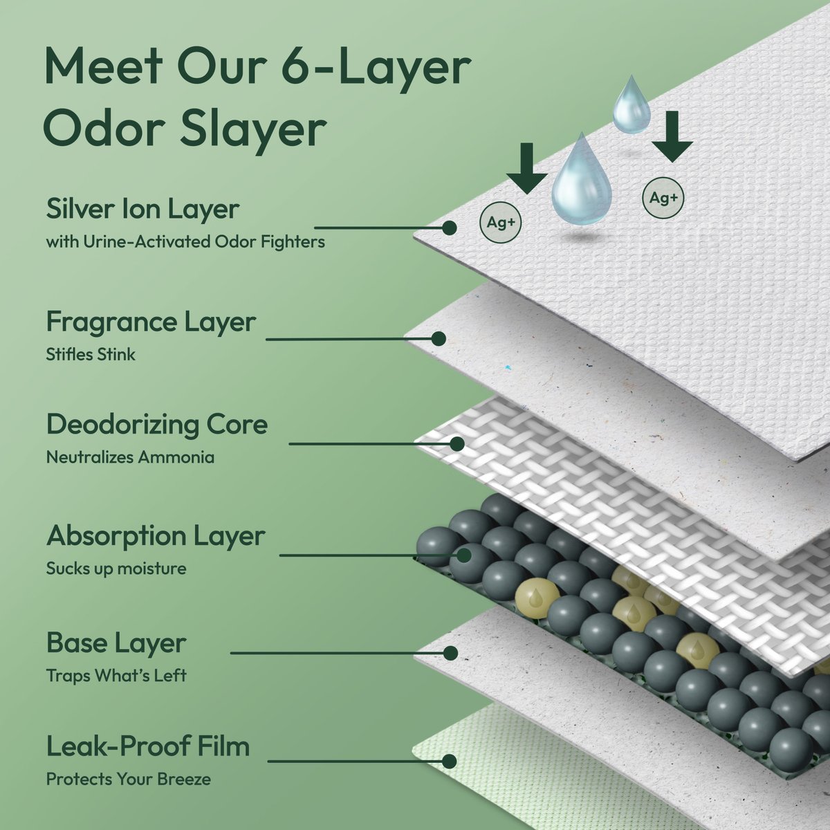 Woven with six layers of absorption and deodorizing technology including Silver Ions, Breeze pads soak up and neutralize ammonia odors on contact, staying fresh for up to 7 days for 1 cat.