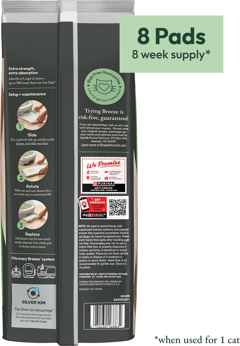Woven with six layers of absorption and deodorizing technology including Silver Ions, Breeze pads soak up and neutralize ammonia odors on contact, staying fresh for up to 7 days for 1 cat.