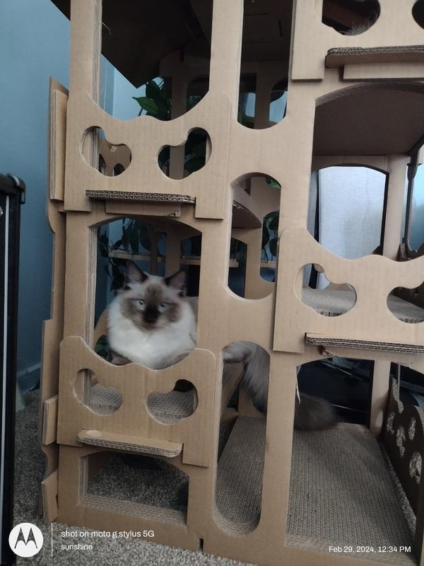 OMG, this thing is amazing! The fosterer had one, so we bought the same thing hoping our 3 kittens would know what it was for and it absolutely worked! They've played with this thing so much it looks like a tornado went through it! We stuck a fishing pole cat toy in the chimney and they had hours of fun trying to catch the "bird" and run away with it only for it to flip back when the tension ran out! It's durable (perfect for teething kittens) and the scratch pads are great. The little bits of cardboard that get on the floor are easily vacuumed up and I love that it is recyclable. It *can* be a bit fiddly to put together, because some of the cuts are tight (you want them to be secure, don't you?) but if you take your time and follow the directions, it's worth the effort. I absolutely recommend this, and have!