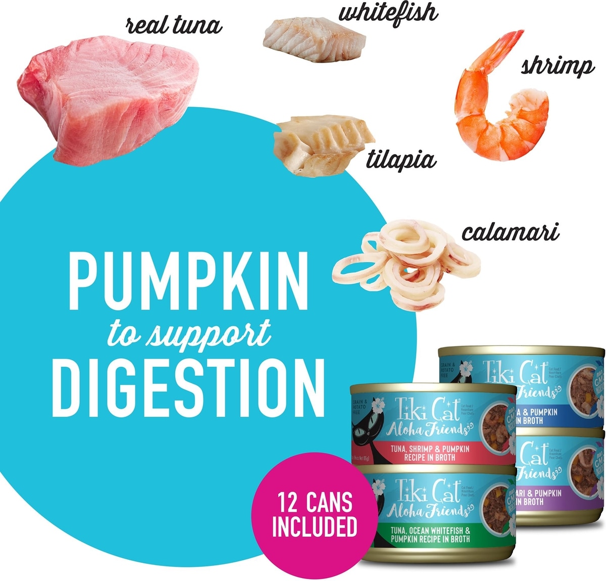 Tiki Cat Aloha Friends complete, and balanced wet cat foods are gentle on the stomach and intense on the taste buds! Each recipe is packed with nutritious protein from real chicken or fish, and fiber-rich pumpkin to support healthy digestion.