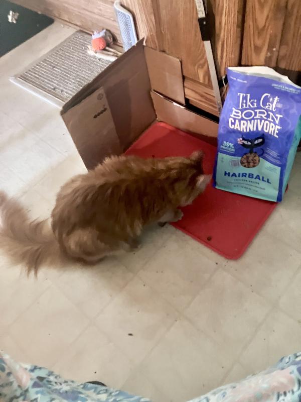 The Tiki Cat Hairball Chicken Recipe is wonderful! I wanted something to help our cats since they had hairballs often and aren’t always easy to brush. The prebiotics and fiber has helped lessen those uky lumps you find on the floor at times. I first wanted to make sure that they weren’t going to reject it so I gave them some on their mat. They ate it up voraciously! Yeah! It’s big enough to use as treats also so it’s a win win.