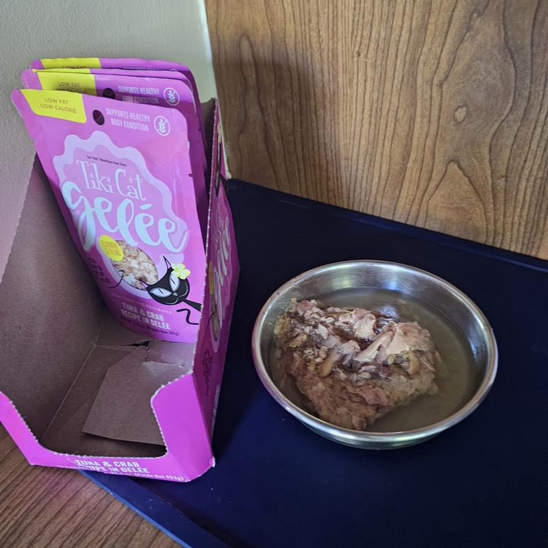 My cats love the delicious Tiki Cat Gelée tuna & crab recipe. I have two 14 year old cats that could use the extra hydration. The pouch is deep so I suggest a long