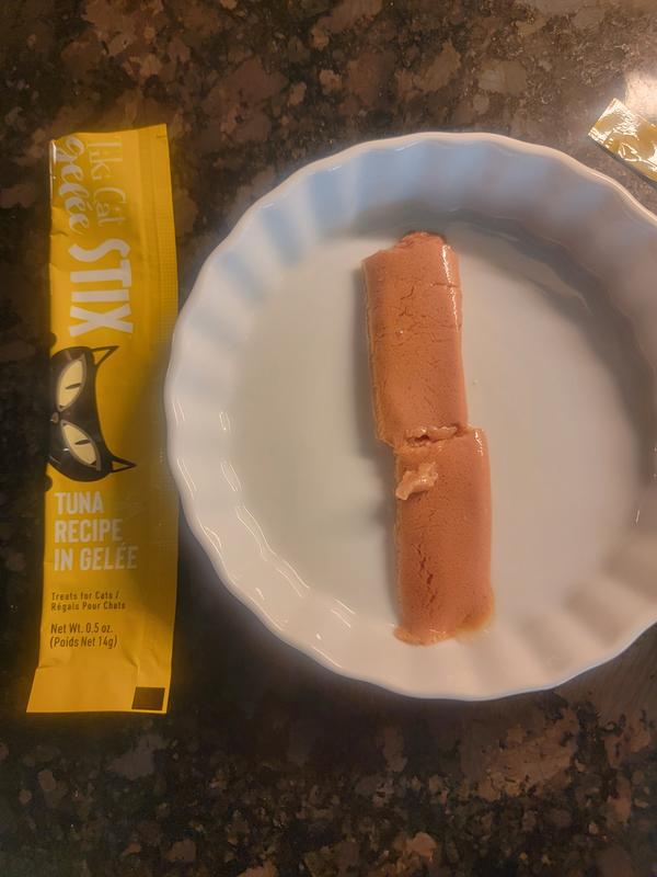 My boys are allergic to almost everything and usually only get their Rx food. However, Tiki is a staple treat and these gelee sticks, to my absolute surprise, are a massive 10/10 hit. It has a VERY strong tuna smell, which they love. It's has the texture of a firm & formed pate, with a jelly (gelee) 'ring' around the outside. Once again Tiki for the win!