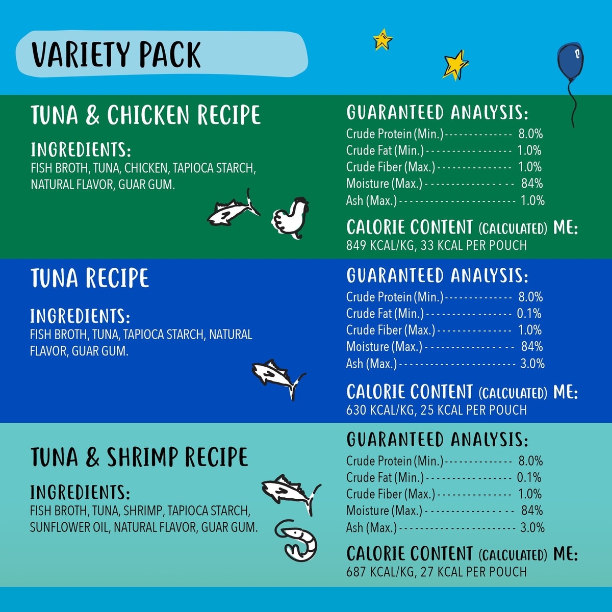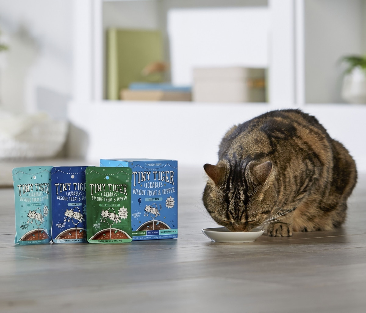 Tiny Tiger, Lickables, Variety Pack, Bisque Cat Treat & Topper, 1.4-oz, case of 12—Reward all your feline friend’s greatest feats with the show-stopping flavor and kitty-preferred texture of Tiny Tiger Lickables! This variety pack of 12 purees—featuring tuna and chicken, tuna and shrimp, and classic tuna recipes—is perfect for finicky felines and can be enjoyed in a bowl as a lickable treat, hand-fed from the pouch for a little bonding moment or served over kibble to take dinner to a new level of deliciousness. However your kitty gets the goods, they’re sure to flip for these silky-smooth feline favorites. Plus, with no corn, wheat or soy ingredients and no artificial flavors, colors or preservatives, you can feel good about their new favorite feel-good snack.
