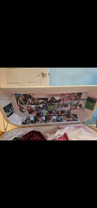 I will always use a doggy casket from now on. I knew my precious IV was declining and that within the next 2 months I would lose her so I decided to buy her this casket. Tragically right after I received this, the next day she slipped, fell and there was no coming back. We had to let her go and I was so glad I had ordered this. The pictures in the inside didn't really stick well, but they stuck enough for the time I wanted them up. I think everyone should have one, if you know that your dog will be passing. Make sure you give yourself time for delivery. The first casket I ordered was out of stock and I had to re order another one 2 days later. It took about 3 to 4 days for me to receive it, once confirmed thst this one was in stock. My dog was around 55 lbs, but was very tall. Large breed dog and I purchase the extra large casket. 100% measure your dog before. I wasn't sure if I sure get this larger size and I am glad I did. She would have not fit if it was smaller. Any dog over 75 lbs, needs a larger casket. This casket would not have fit a great date due to their legs and my dog was a little shorter than a greatdane.