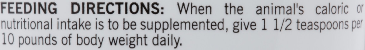 When the animal's calorie or nutritional intake is to be supplemented, it is recommended to give 1.5 teaspoons per 10 pounds body weight daily. When used as the main source of nutrition give 3 teaspoons per 10 pounds body weight daily. The 4.25 ounce tube contains approximately 25.5 teaspoons.