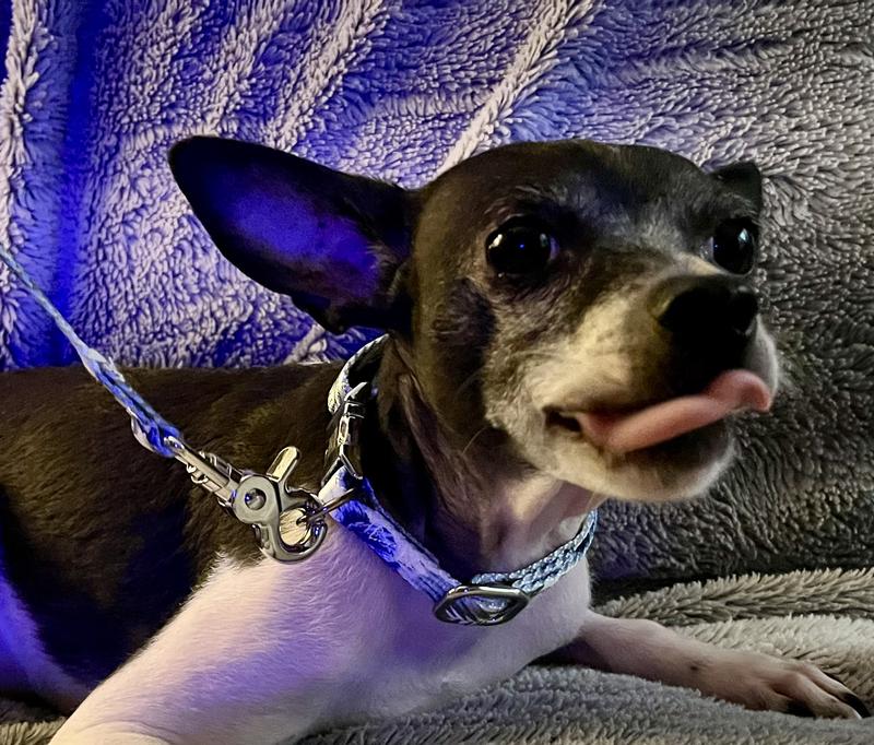 This collar and leash set is super cute and looks so dapper on my Mini Aussie, Astro. Astro had a red collar on for a long time and this one adds so much character and fun that not only compliments his personality but is also a top quality collar and leash set. The material is comfortable in hand but durable which is just fantastic for the pup and human alike!
