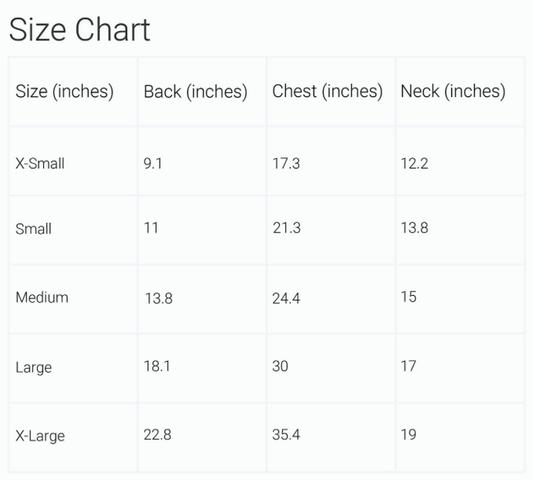 The sizing chart may be located by clicking the “Size” tab, on the product page. To select the best size we recommend that you measure your dog's length, chest girth (circumference) and neck girth (circumference). To measure the length you'll measure starting at the base of the neck and end at the base of the tail. To measure the chest girth you'll measure around the broadest part of the rib-cage behind the front legs and to measure for the neck girth you'll measure at the broadest part of the neck. If the dog happens to be in between sizes, it's then recommended to select the bigger size.