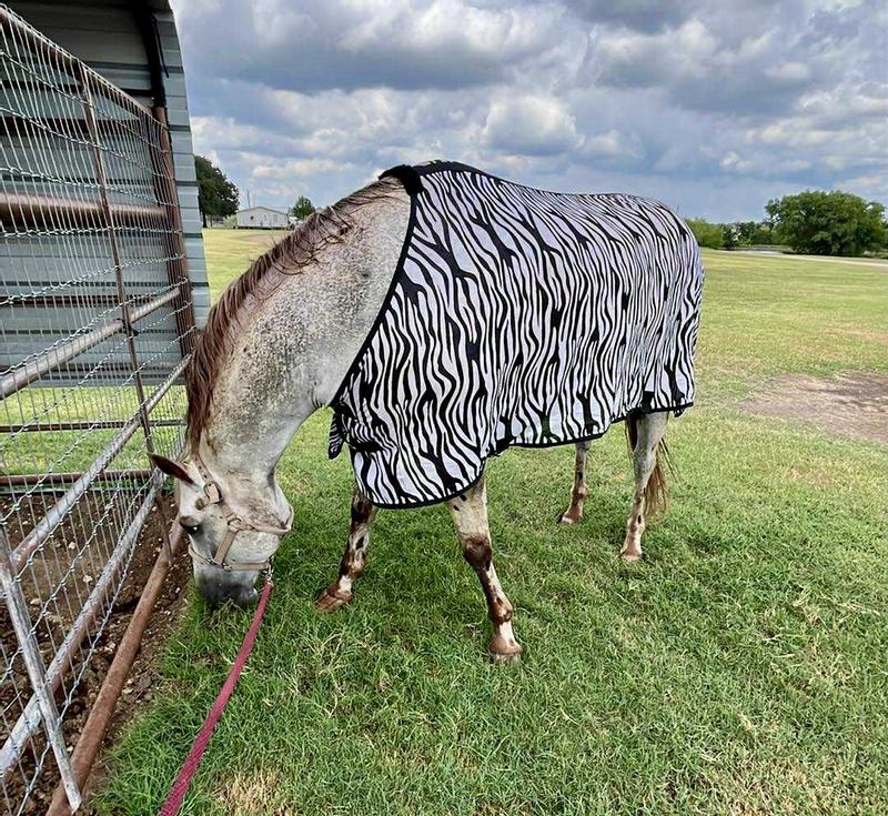I now have a zebra in my pasture! It’s light weight and helps keep the horse flys off his back.