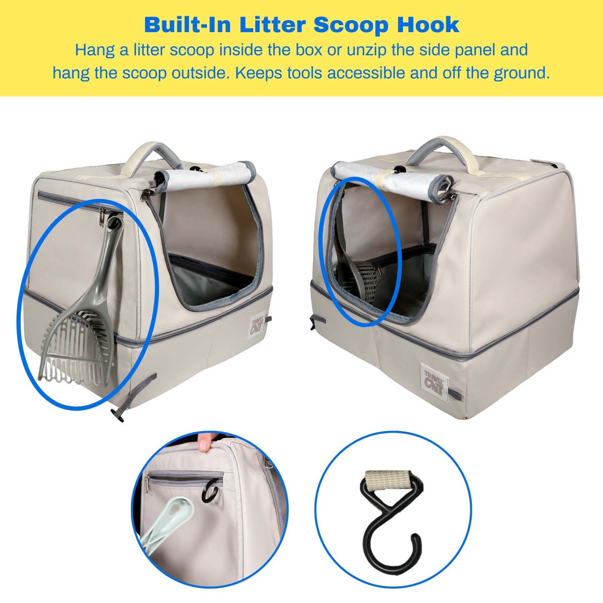 Features a hook for hanging a litter scoop and a roll-up front door for easy entry and exit.