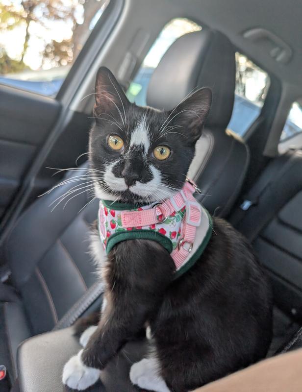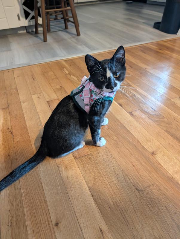 Super cute and very secure. My cat is very good at slipping right out of certain harnesses but between the Velcro and the clip closures this one stays on well and doesn't shift at all so my cat has not slipped out which is a huge relief.