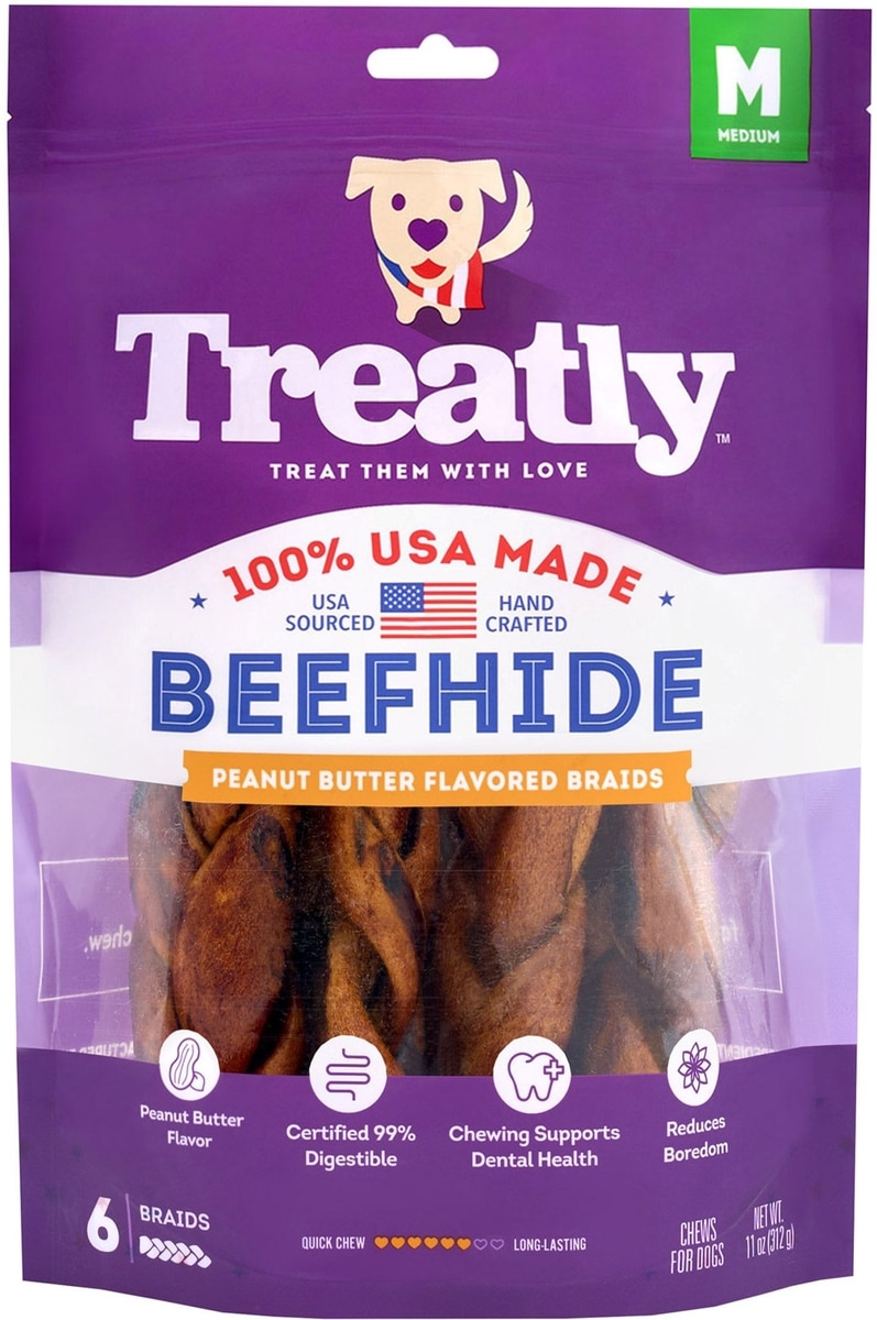 Treatly USA Beefhide Braids 7 to 8-in Peanut Butter Flavor Dog Chews, 6 count