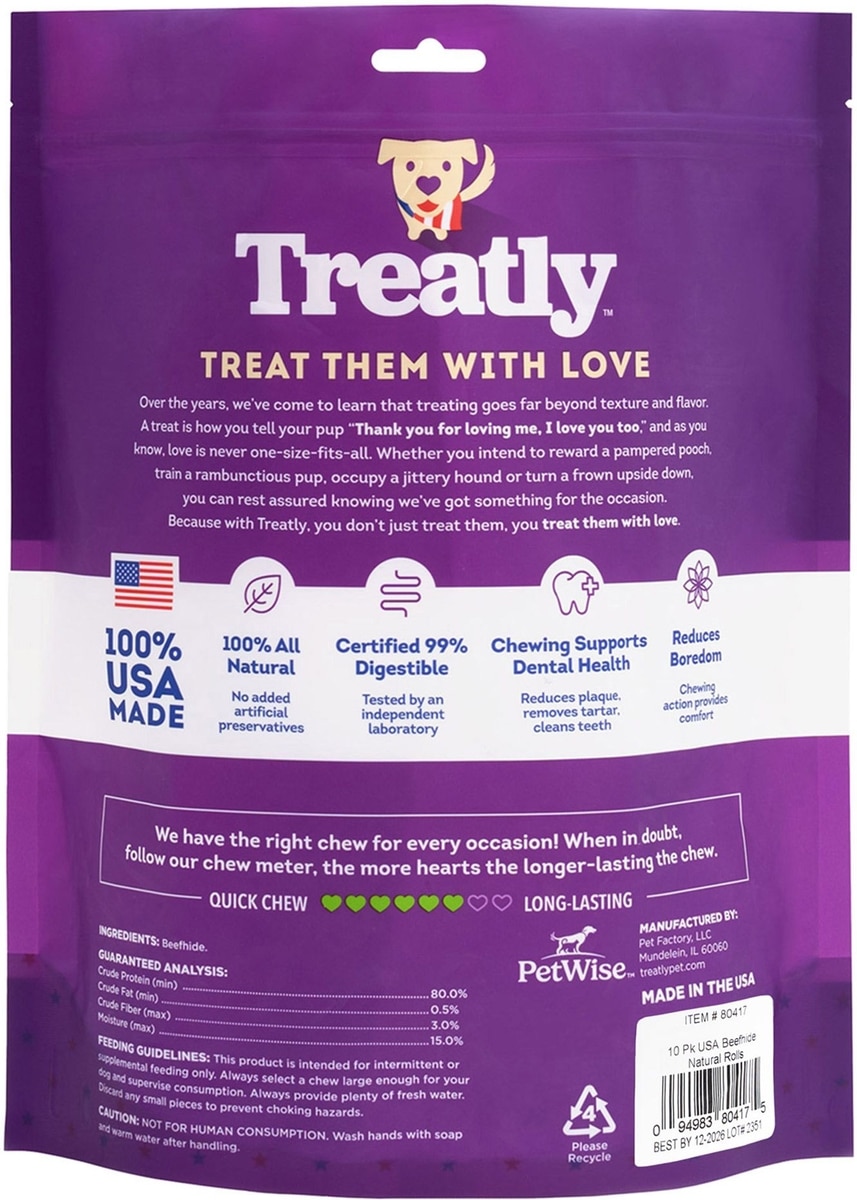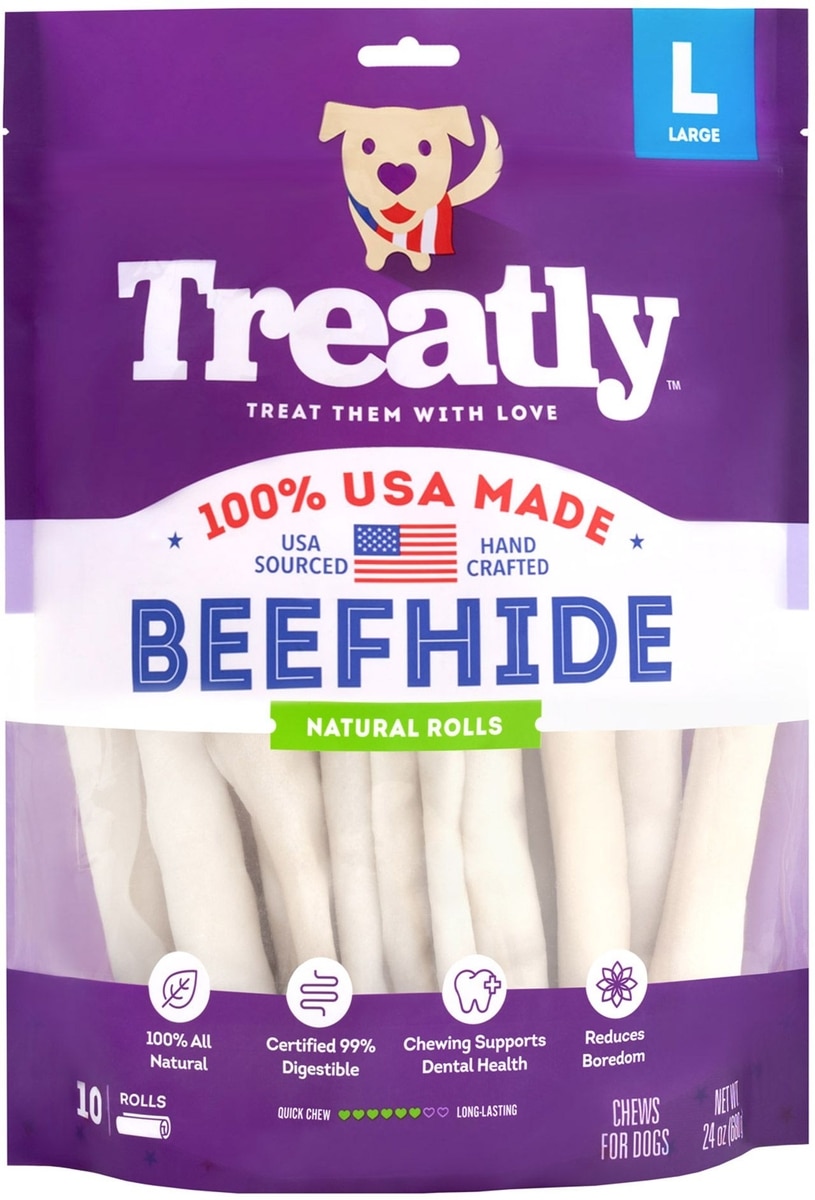 Treatly USA Beefhide Rolls 8 to 9-in Natural Flavor Dog Chews, 10 count