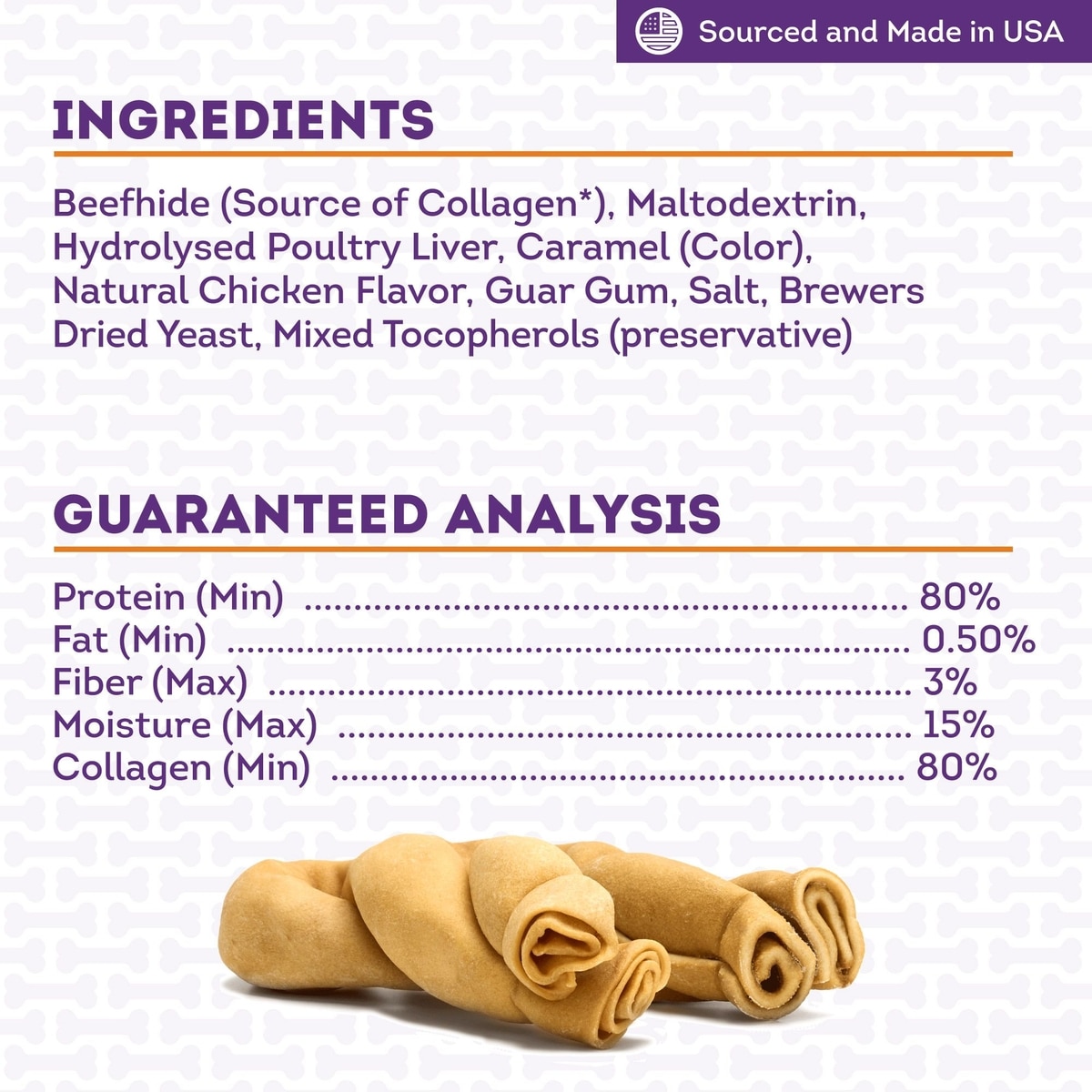 Beefhide (Source of Collagen*), Maltodextrin, Hydrolyzed Poultry Liver, Caramel (Color), Natural Chicken Flavor, Guar Gum, Salt, Brewers Dried Yeast, Mixed Tocopherols (preservative).