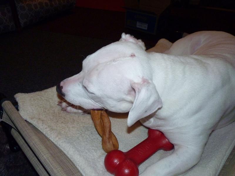 I'm always looking for non-rawhide chews that take my insanely-power-chewing, always-starving pittie mix a while to eat. I got the "natural" Treatly twists at a
