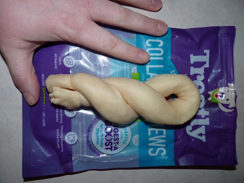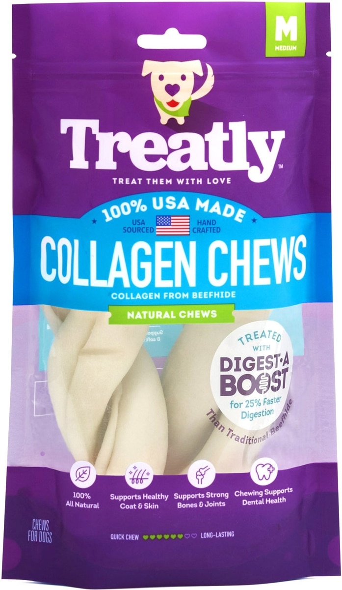 I'm always looking for non-rawhide chews that take my insanely-power-chewing, always-starving pittie mix a while to eat. I saw these on sale at a local farm store and am really glad I gave them a try, even more glad to find them on Chewy! They're a good size for my big-jawed 60lb dog and would probably be okay for slightly larger dogs since they're made with one folded piece of collagen instead of multiple smaller pieces like most of the other twisted/braided ones I've bought. There is no smell and no mess. Best part? They took her almost an HOUR to eat!!! My go-to for affordable, everyday chews will always be Pork Chomps, but those only last ~15-40 minutes depending on the type/size. These twists are comparable in size to the 6" Pork Chomps knots (pictured) that only last about 25 minutes. These Treatly chews are way more expensive, but worth having on hand for when I need a decent amount of quiet time like with company over for dinner. The only chew I've found that lasts longer than these are Sweet Comb brand collagen rolls (not on Chewy yet). Those usually take her at least a few hours in multiple sittings to finish but can be a bit messy and are more expensive than these when they're not on sale. I'd highly recommend these for heavy chewers and will definitely be trying the brand's other collagen chews!