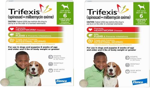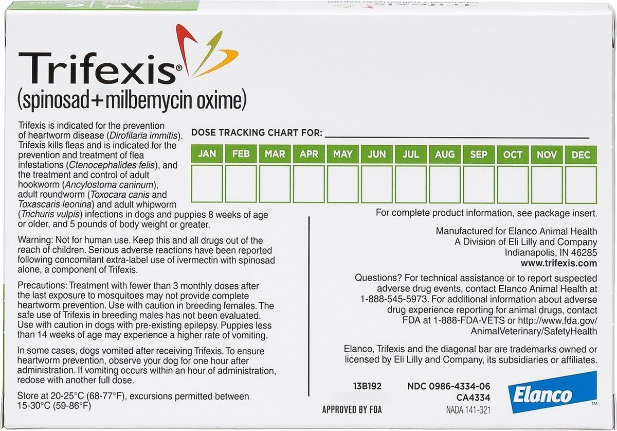 The use of ivermectin at higher than FDA-approved doses at the same time as Trifexis can result in serious side effects. Treatment with fewer than three monthly doses after the last exposure to mosquitoes may not provide complete heartworm prevention. Prior to administration of Trifexis, dogs should be tested for existing heartworm infection. Use with caution in breeding females. The safe use of Trifexis in breeding males has not been evaluated. Use with caution in dogs with pre-existing epilepsy. The most common adverse reactions reported are vomiting, decreased activity, itching, decreased appetite, and diarrhea. To ensure heartworm prevention, observe your dog for one hour after administration. If vomiting occurs within an hour of administration, redose with another full dose. Puppies less than 14 weeks of age may experience a higher rate of vomiting. For complete safety information, please see Trifexis product label or ask your veterinarian.