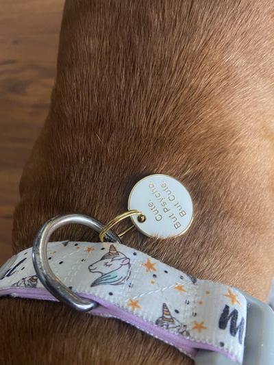 Super cute name tag! I have a 4lb yorkiepoo who’s a little crazy and it fits her personality perfectly lol. It’s really sturdy and made well !