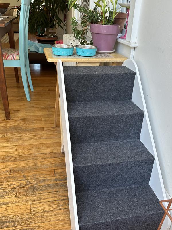 What a perfect set of stairs! They arrived already assembled and were easy to set up. Now our senior cat can reach her food easily while keeping it elevated and away from the dog. The carpet-like tread makes it slip resistant as she goes up and down. The adjustable height means it lines up perfectly with her food table. Better than I expected and so glad we got this!