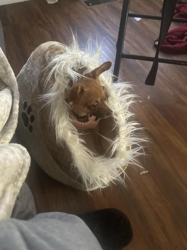 My chihuahua Buddha loves this bed. It’s kept him warm and snug. I added a blanket in it to make it more comfortable for him. The fluff at the end doesn’t seem to
