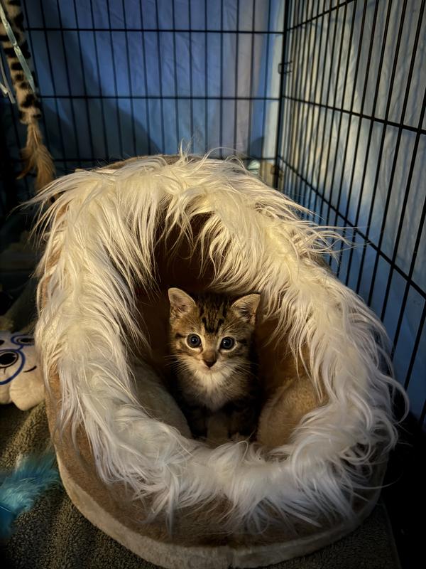 This little hidey hole bed is adorable! Our 5 week old kitten loves it. We found her hunkered in a bush under some leaves & brush. So we thought this would work perfectly to simulate that. It did not disappoint. She hopped right in & fell asleep. It’s sturdy enough that she can climb all over it, including on top. The inner bed is removable. I’ve only had to clean it once with a baby wipe, when she tracked her wet food inside it. Very satisfied with this purchase. And it’s large enough that she will grow into it for hopefully years to come.