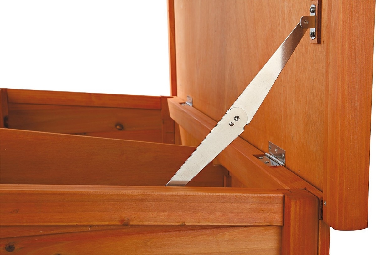 The hardware is flimsy. The arm bends easily when you close the lid of the hutch. Then nails and lid of hutch tore off when I opened it to take care of my rabbit