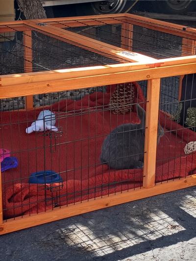 Our rabbit is enjoying more space! One of the side panels is held in place by two plastic hearts. We added hinges to that panel, removed the hearts, and added a