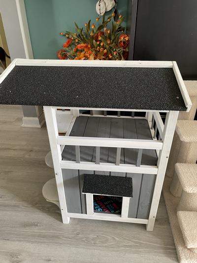 Love love love this little house. Living in a townhome with 4 cats that can hang out on an outside deck is one thing but now they have a great space to protect them from the elements. Easy peasy to put together and great quality for the price.