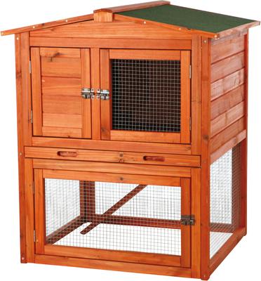 Cheap made, do not buy. Several pieces of wood was broke off in shipping in which we had to glue back together. our rabbit has already chewed holes in the wood. The piece of wood that keeps rabbit in upper cage is already broken from him chewing. We have had this for about 3 weeks it looks like our rabbit has lived in it for months