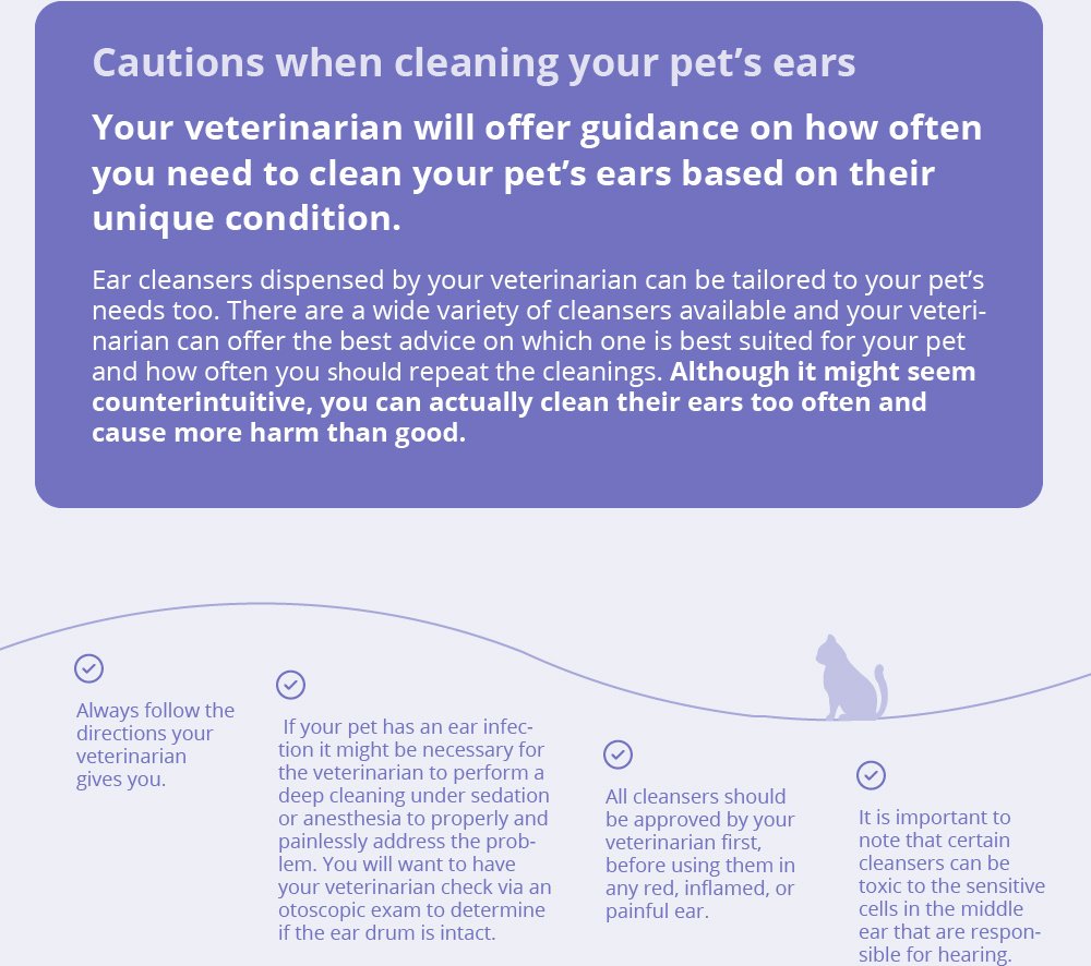 This anti-microbial, antibacterial, anti-fungal ear and skin flush and cleanser for pets prone to infections caused by yeast and bacteria. Your veterinarian will offer guidance on how often you need to clean your pet’s ears based on their unique condition. Ear cleansers dispensed by your veterinarian can be tailored to your pet’s needs too. There are a wide variety of cleansers available and your veterinarian can offer the best advice on which one is best suited for your pet and how often you should repeat the cleanings. Although it might seem counterintuitive you can actually clean their ears too often and cause more harm than good, so always follow the directions your veterinarian gives you. It is important to note that certain cleansers can be toxic to the sensitive cells in the middle ear that are responsible for hearing. All cleansers should be approved by your veterinarian first, before using them in any red, inflamed or painful ear. If your pet has an ear infection it might be necessary for the veterinarian to perform a deep cleaning under sedation or anesthesia to properly and painlessly address the problem. You will want to have your veterinarian check via an otoscopic exam to determine if the ear drum is intact.