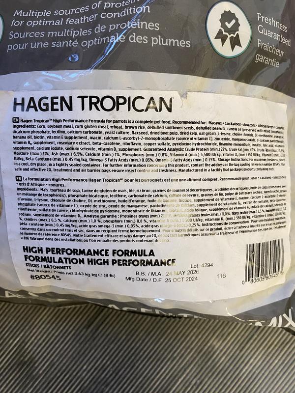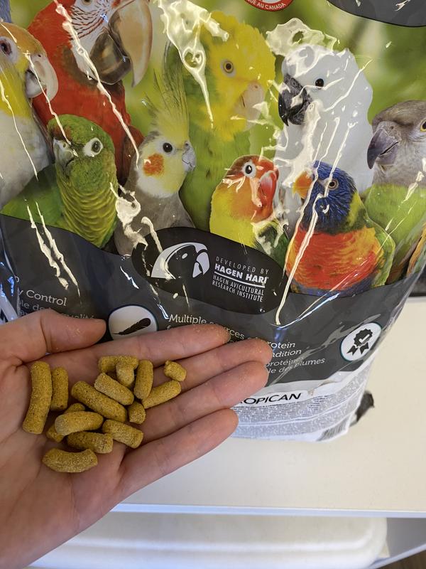 Hari Tropican High Performance Sticks Bird Food, 8-lb bag This product comes beautifully packaged, and I looked forward to trying it out on Charlie (blue-and-gold macaw) and Stretch (greenwing macaw). These birds are both around 20 years old and pretty spoiled. They have eaten nothing but seed-and-nut-based foods their entire lives and seem pretty set in their ways. I have always wondered what they would do if exposed to an extruded bird food because I would prefer to know they are getting a healthy well-balanced diet, rather than picking and choosing their way through what I have been feeding them. I’m sure I don’t look at things in the same way my macaws do, but these Tropican Sticks are one of the most appetizing looking pellet-type foods I have come across. Unfortunately, remember I said “set in their ways.” At first they apparently didn’t share my opinion of what looks appetizing. I then mixed in small amounts of the sticks with their regular food and found equally small amounts of the sticks on the floors of their cages. I haven’t done a detailed study to see if some of the sticks are being consumed, but I think they are eating them. I definitely am going to continue to add this product to their food and to feel good about rounding out their diet.