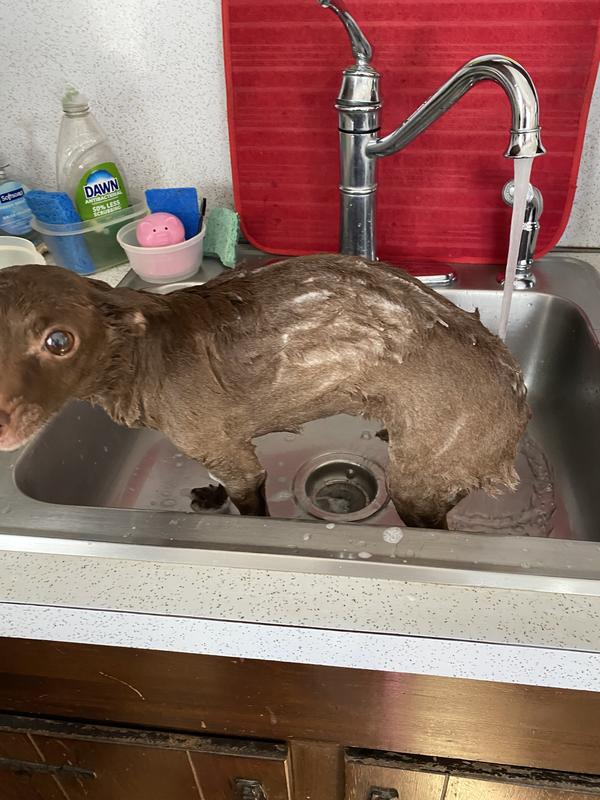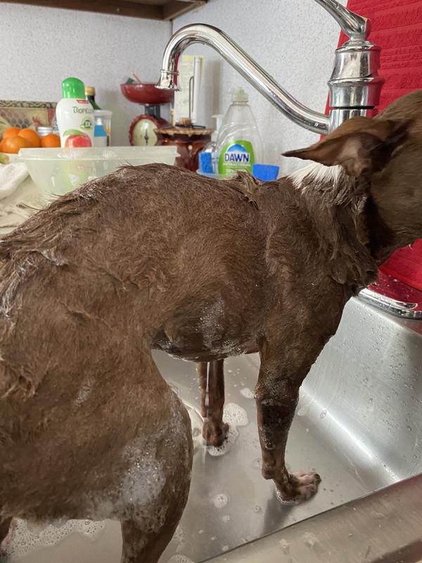 This dog shampoo is amazing, smells wonderful, rinses easily, Chongo’s coat was left shiny. The entire living room smelled delightful. No wet dog smell. I coaxed