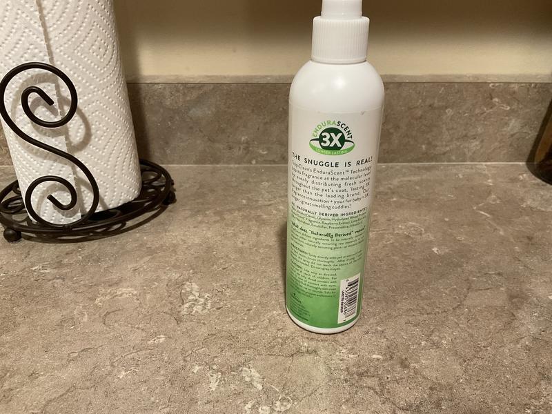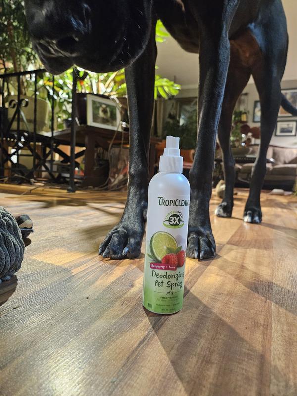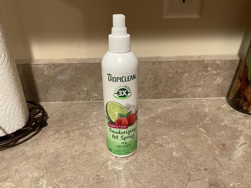 You can't go wrong with Tropiclean Deoderizing Pet Spray. I was looking for something to use between baths to give Ollie that “just groomed” freshness, and this is it! The raspberry lime scent smells amazing! It's a light, long-lasting, clean scent, and I can still smell it on Ollie the next day. The price is right, as is the case with all TropiClean products. And to top it all off, it’s made in the US…for me, that’s a real plus! I highly recommend this product!