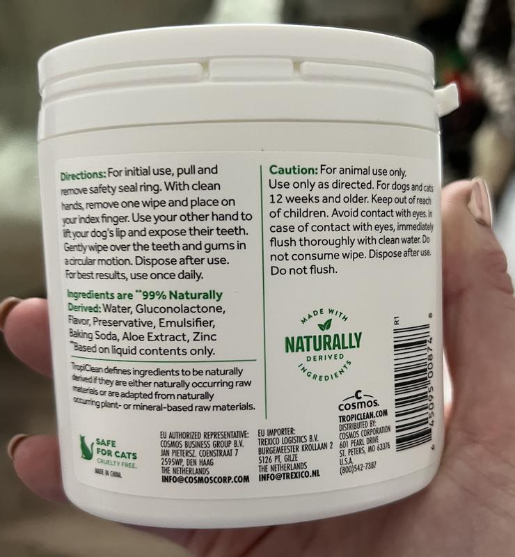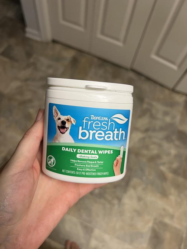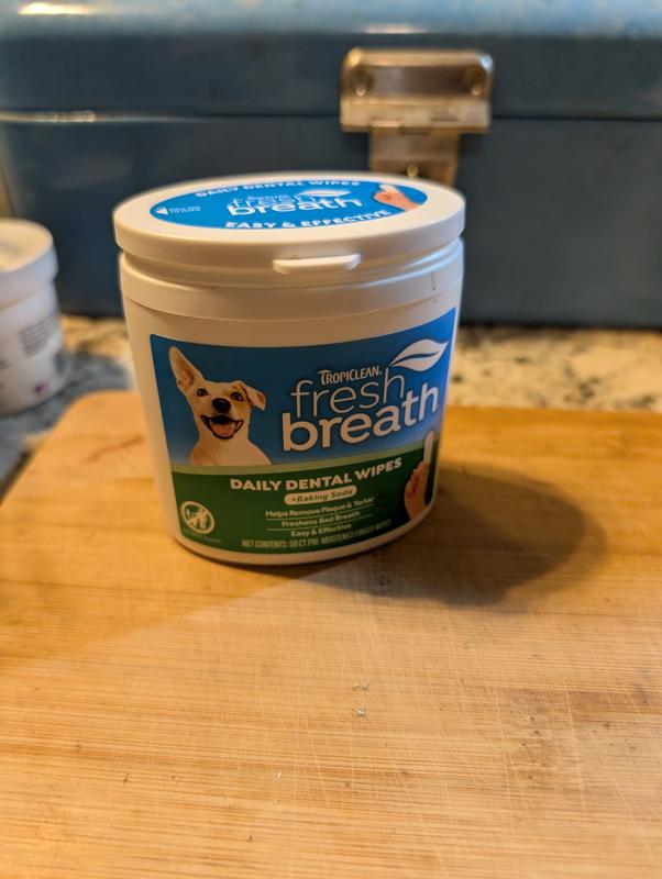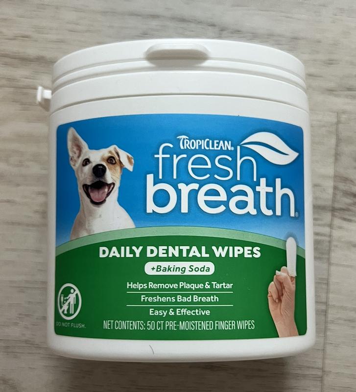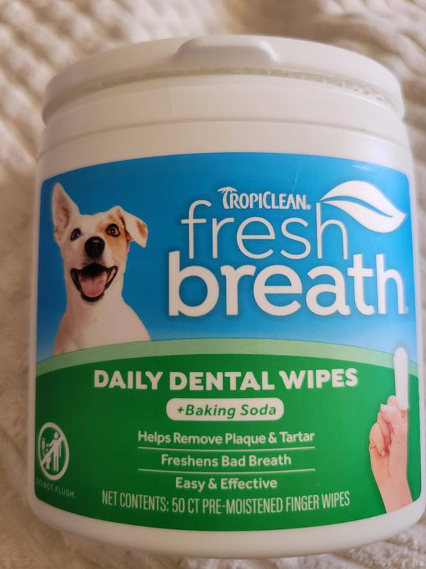 Tropiclean Fresh Breath: Daily Dental Wipes are amazing! It has just made cleaning her teeth and gums so simple. I have tried so many chews that did not work, stuff added to water, which she would stop drinking water, and brushing, which is irritating to me and her. Nothing ever worked. She has terrible teeth and gums. In just one week, half the tarter is gone from her teeth, and her gums are looking so much healthier. Im so happy they made a product that works and is simple. Oh, and a great price too!