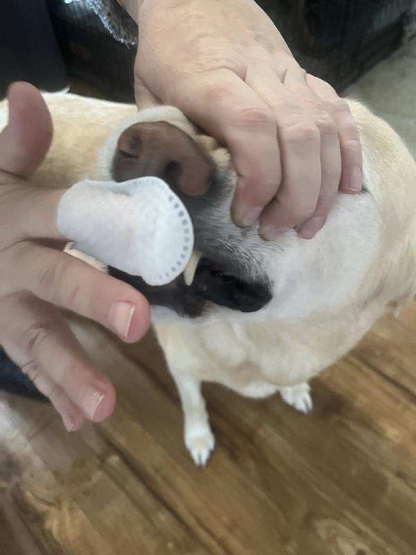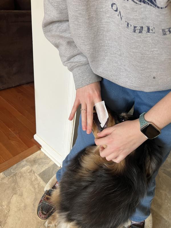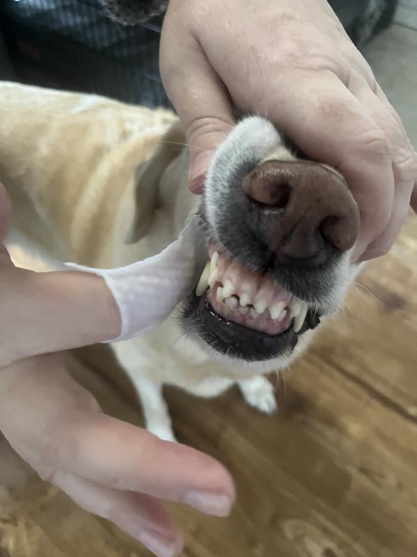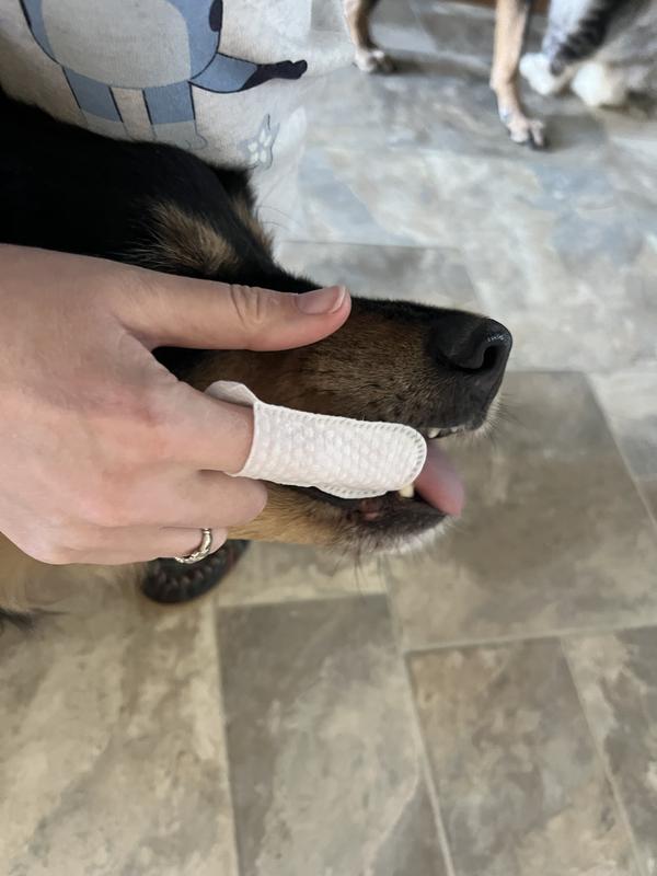 Quick and easy to use! Three dogs of different sizes and this was easy to use with all of them for a quick daily swipe. Dogs don’t mind at all. Love that it has a pocket for your finger to go In.