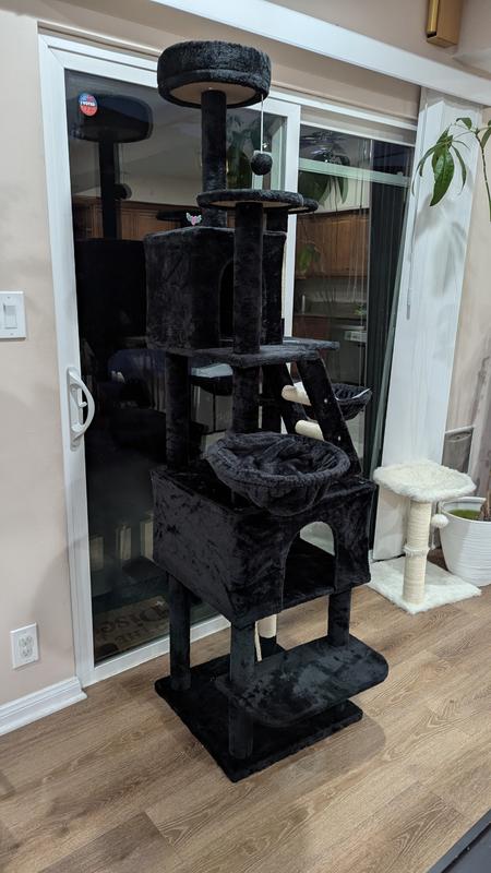The cat tree that showed up was taller than the description, and a bit flimsy. There’s a set of steps that are 2 inches too short to connect, so they just hang
