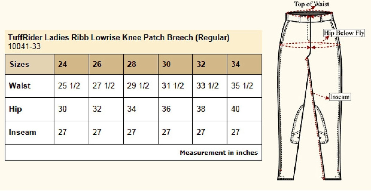 These breeches feature a low-rise design. For the best fit, measure your waist, hips and inseam and compare with the sizing chart below: